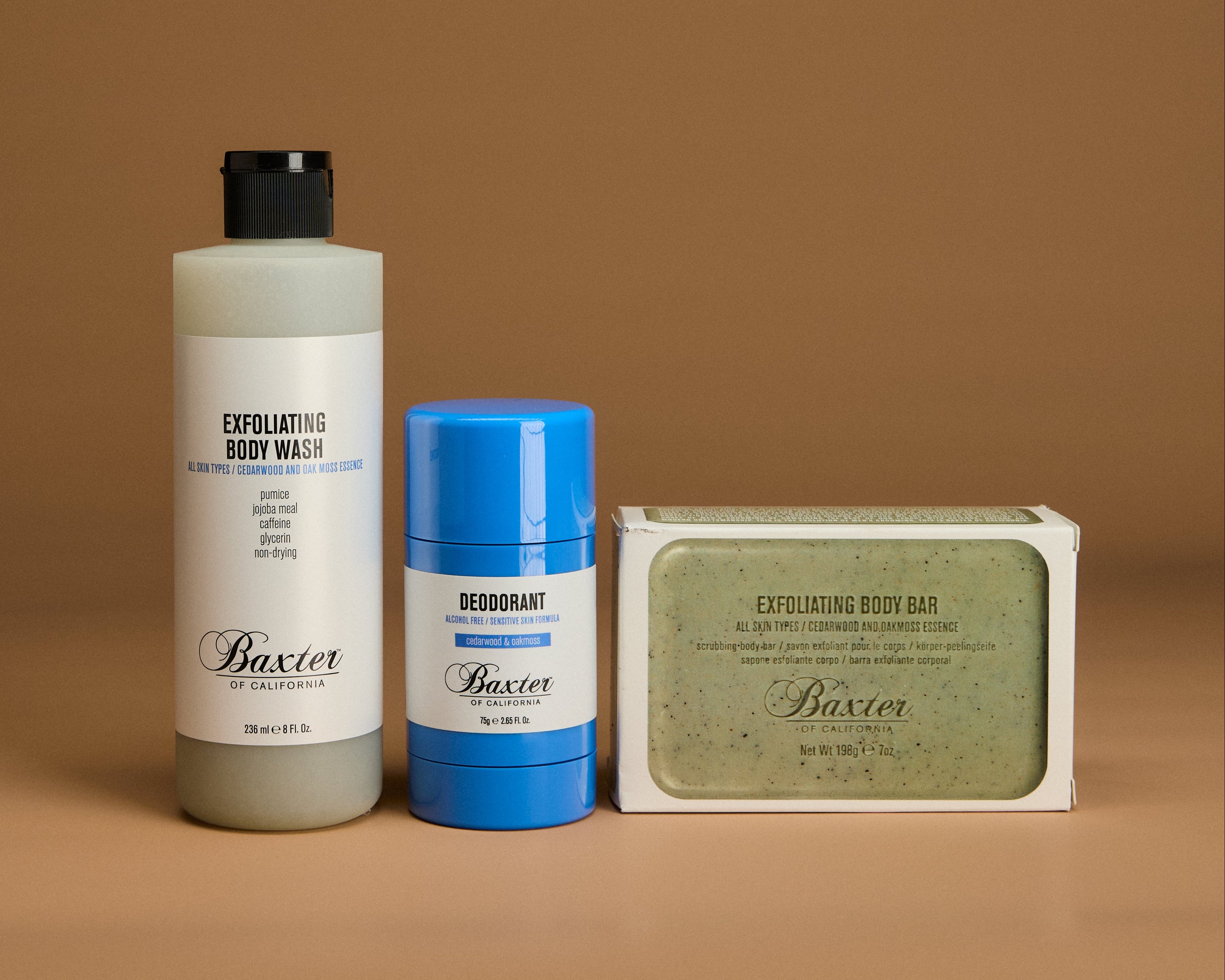 Rich, steady, and enduring – the Cedarwood & Oakmoss Body Trio captures the grounded sophistication of California’s natural landscape. This set includes Exfoliating Body Wash, Exfoliating Body Bar, and Aluminum-Free Deodorant, each infused with warm notes of cedar, oak moss, and smoky amber.